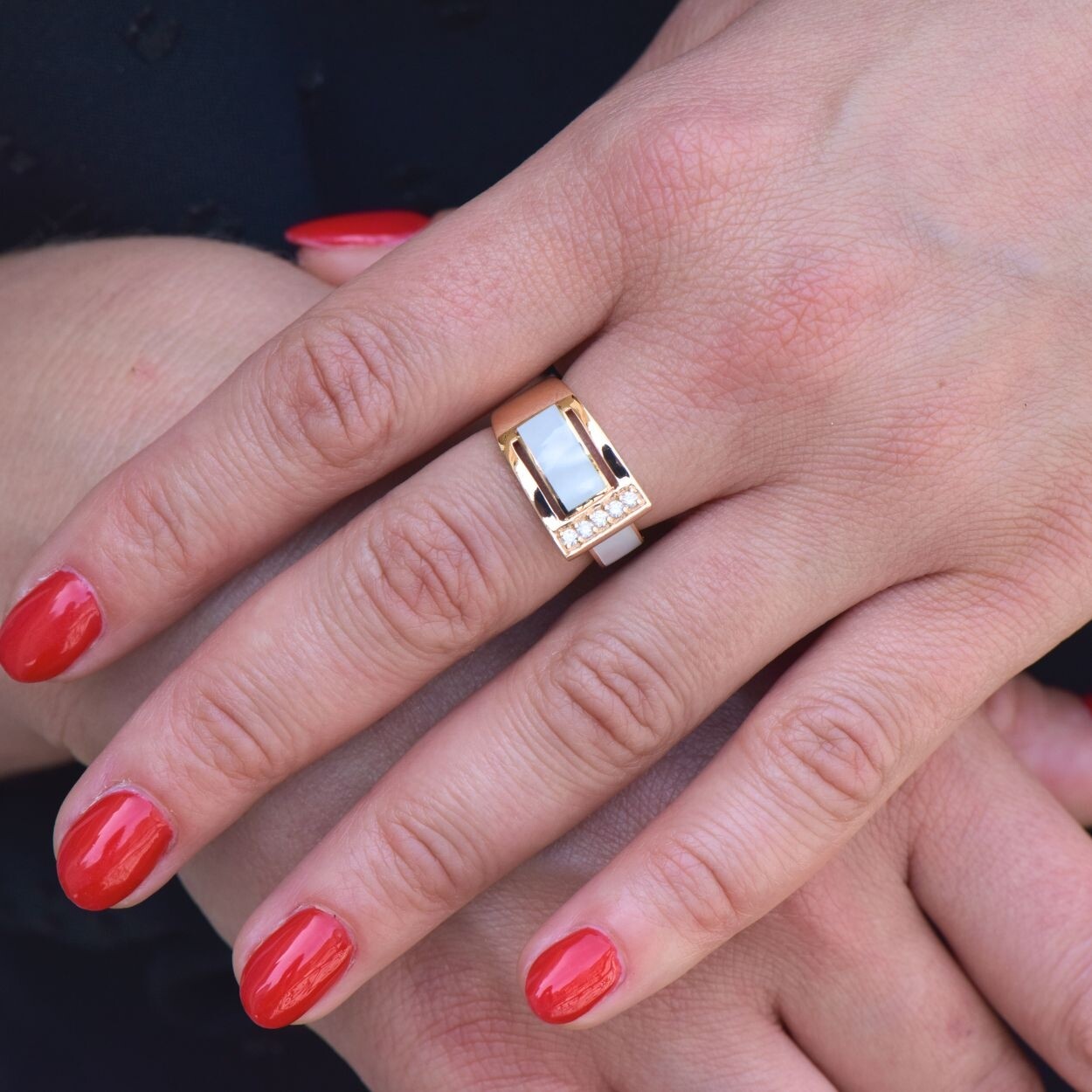 Bague Clozeau DÉFERLANTE en or rose, résine blanc nacré et diamants