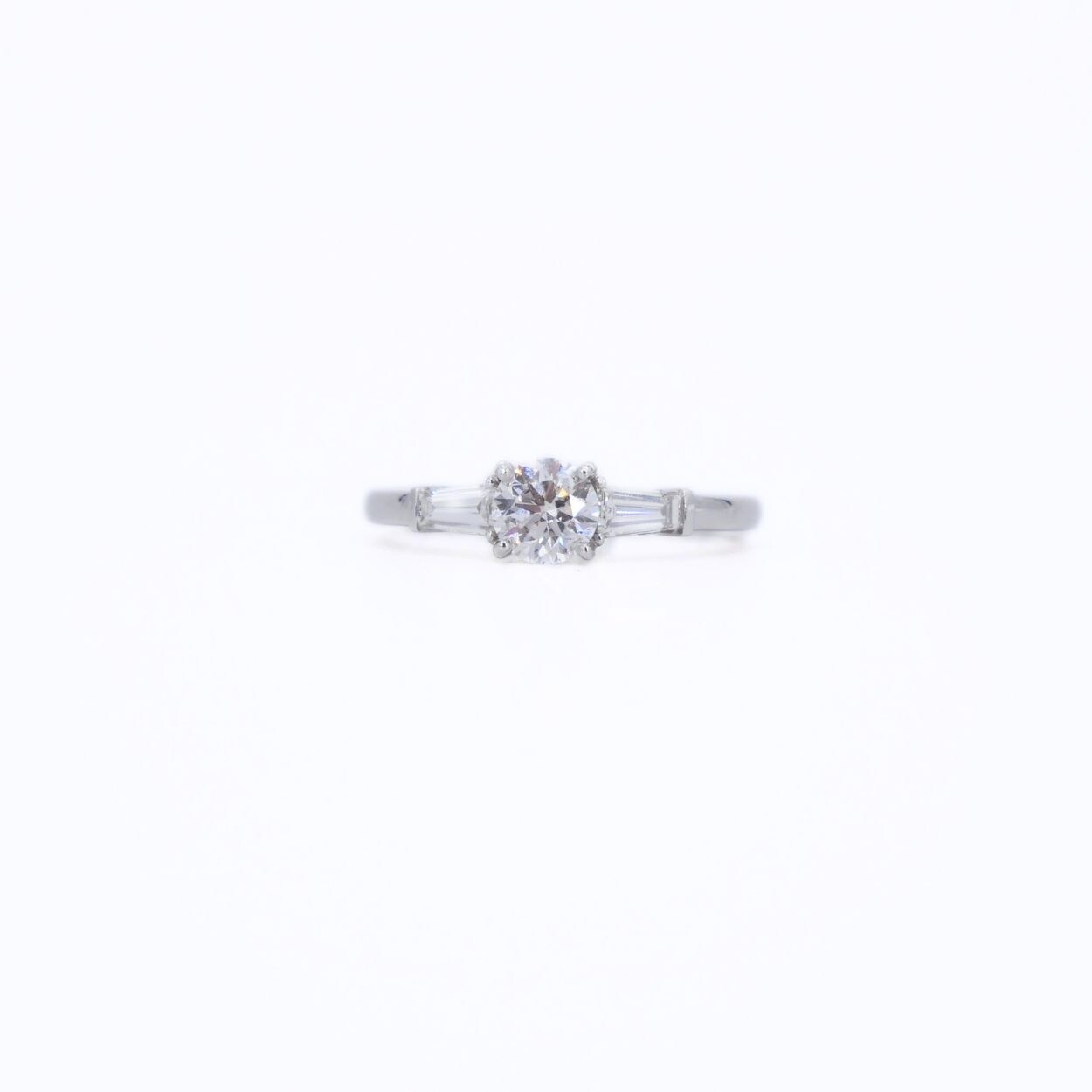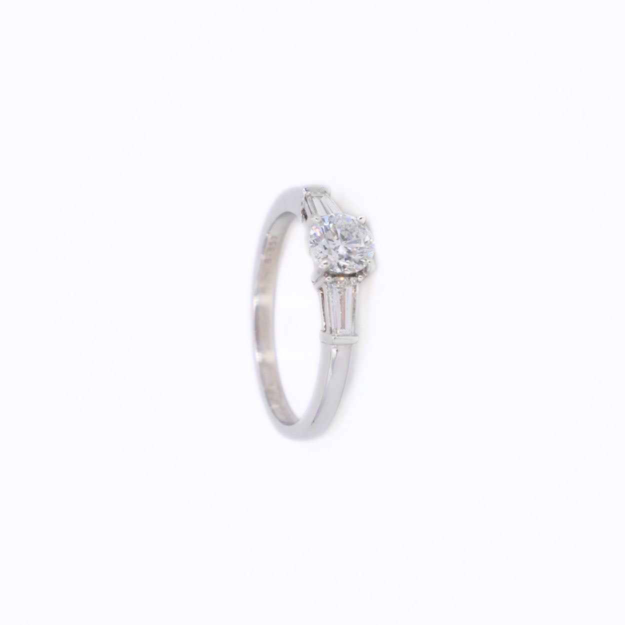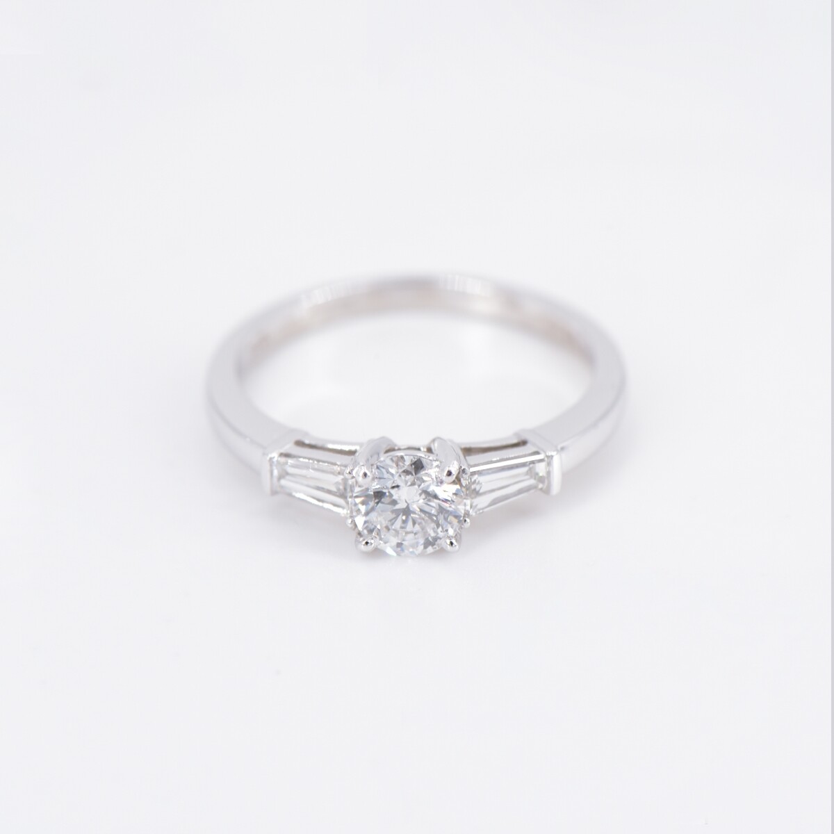 Ce bijou appelé « Solitaire accompagné » est sublimé par des diamants de forme tapers ajoutant une touche de brillance à son design classique.