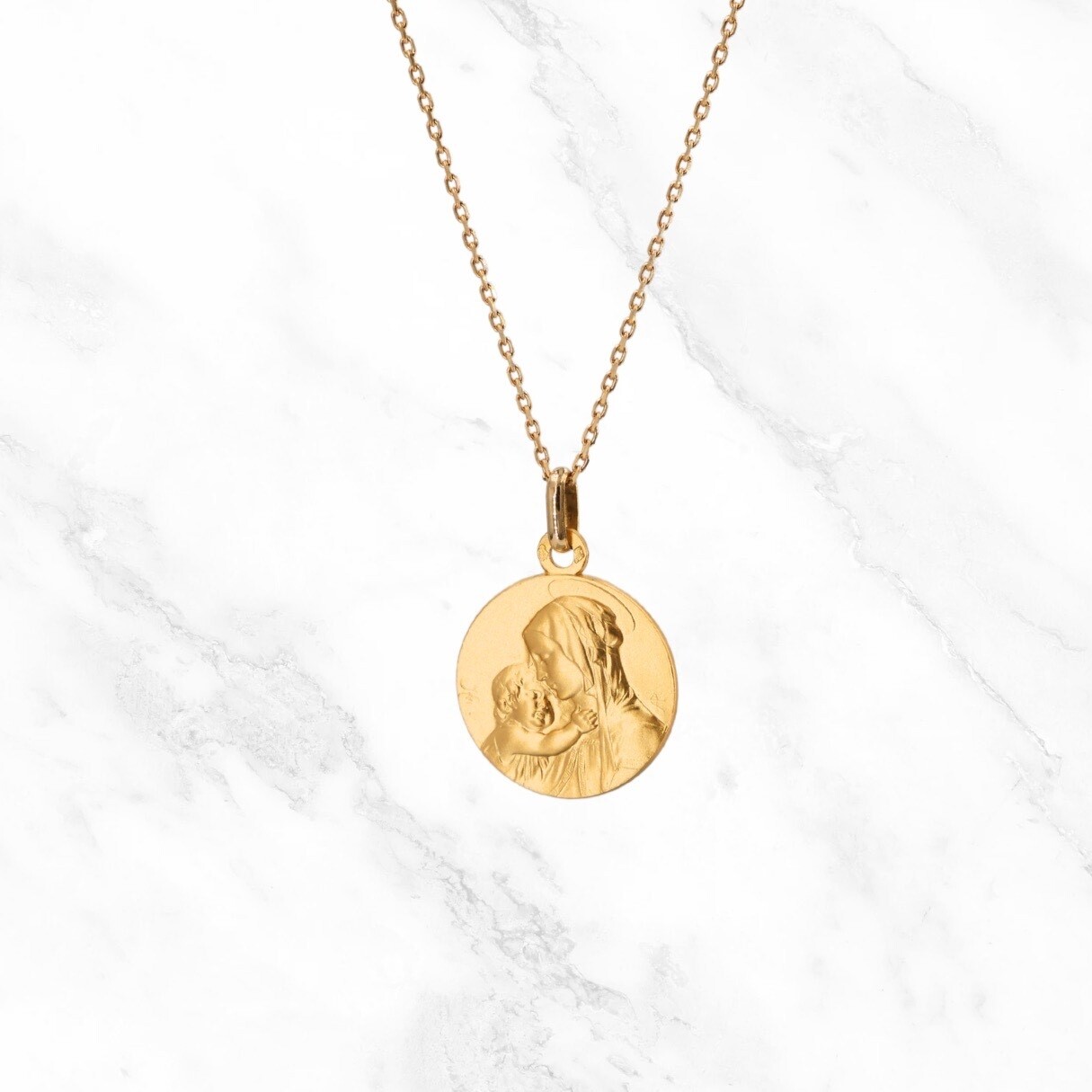 Evoquant une profonde tendresse, cette médaille représentant la Vierge avec l 'enfant Jésus symbolise la douceur, l’amour et la foi, c’est un trésor inestimable à chérir et à transmettre.