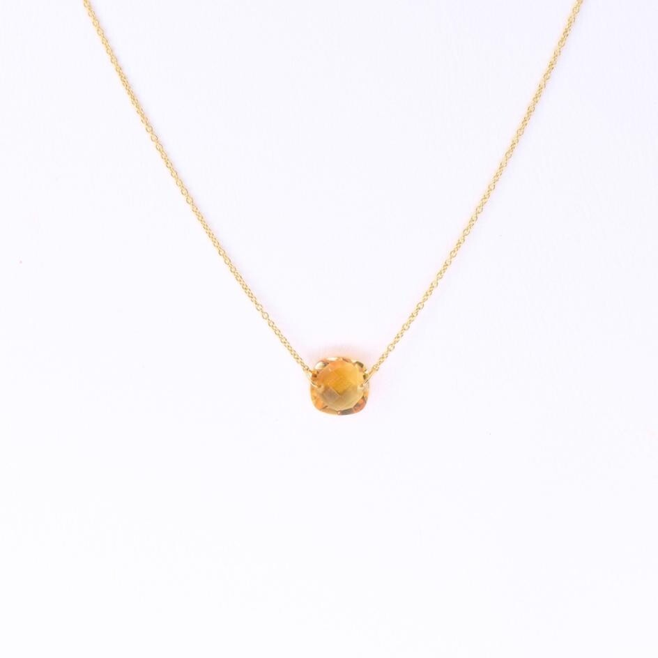 Découvrez notre collier raffiné en or jaune 18 carats et sa citrine de forme coussin entièrement facettée, mesurant 8 par 8 mm. Chaque facette de cette pierre fine irradie chaleur et énergie !