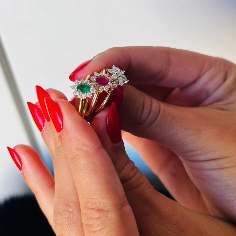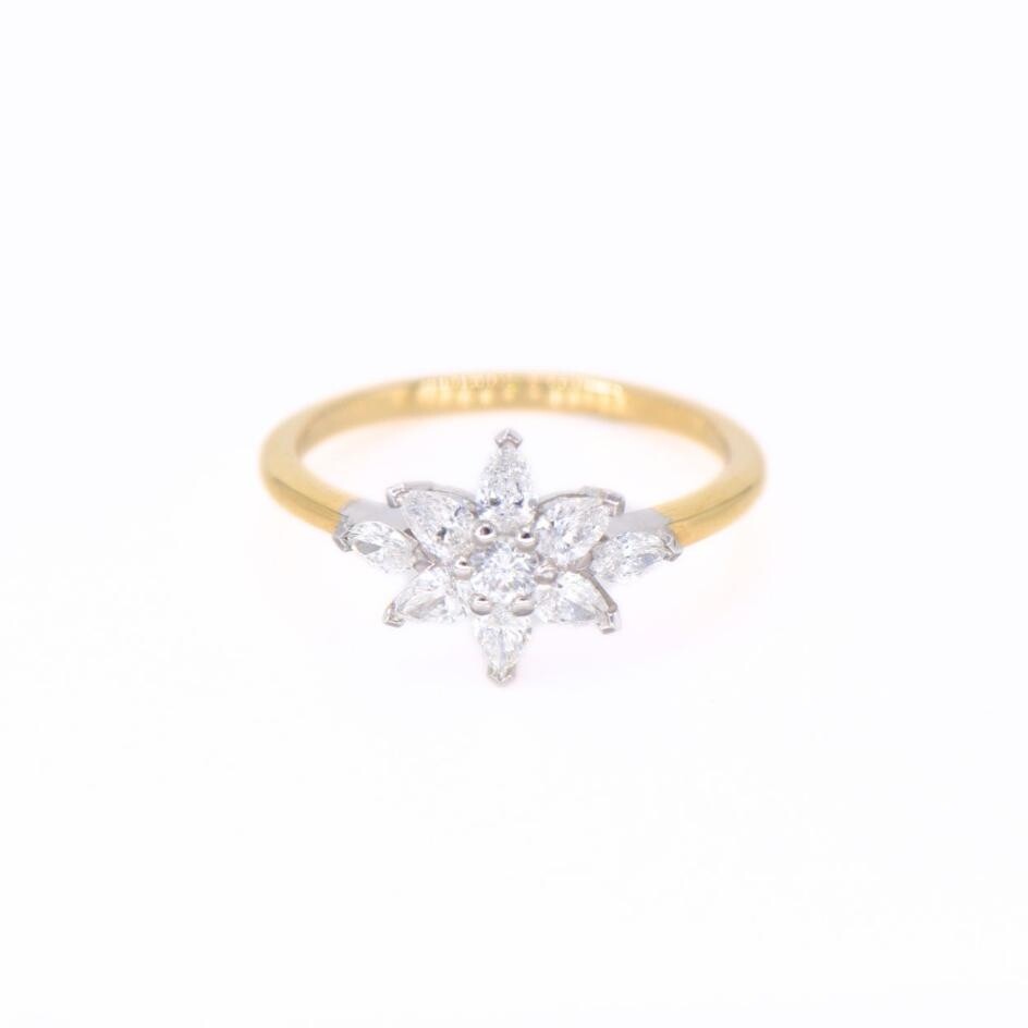 Cette bague en or jaune 18 carats, sertie de différentes tailles de diamants, (navette, brillant, poire) offre un feu exceptionnel et témoigne d’une délicatesse remarquable, faisant d’elle une création éternelle !