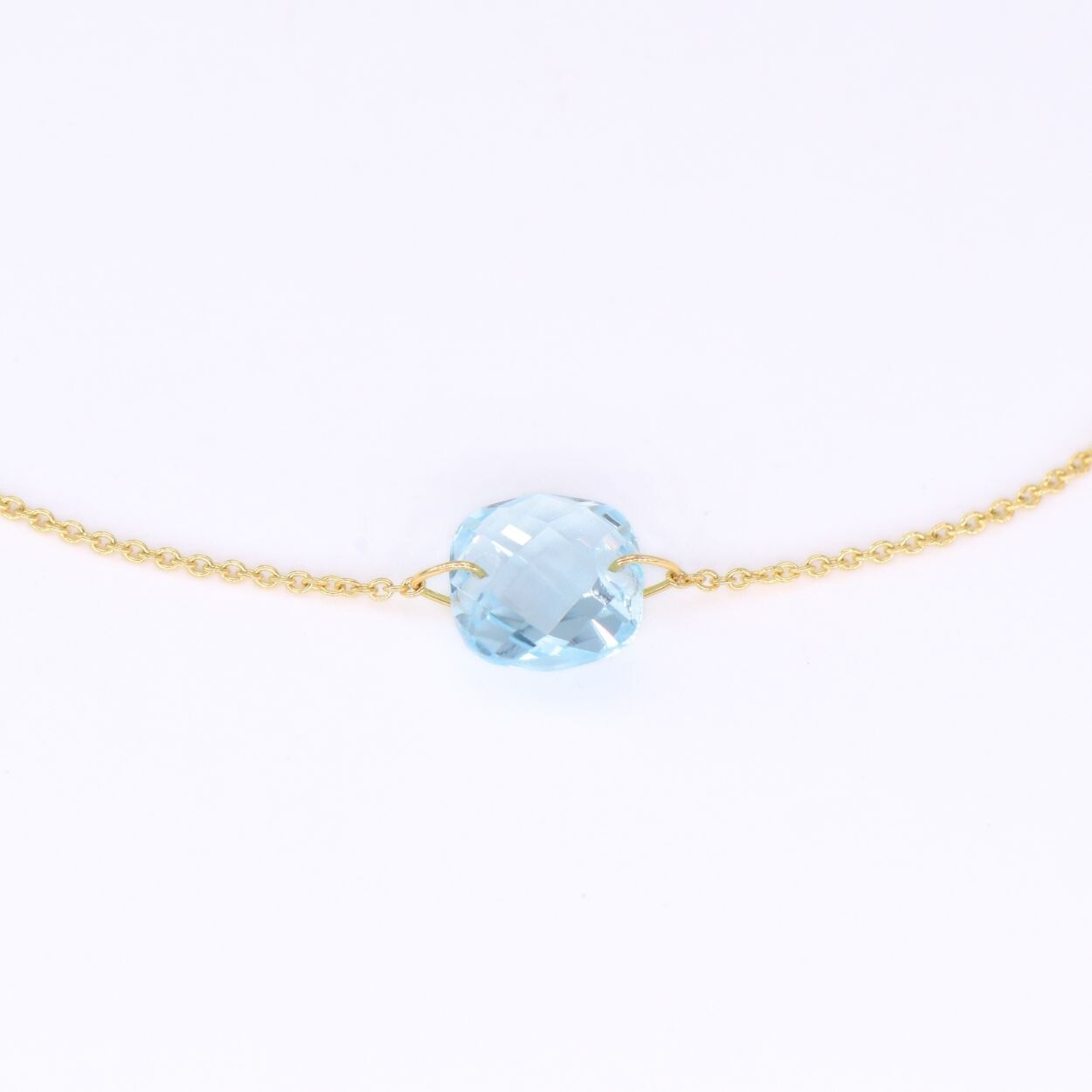 Notre bracelet élégant met en avant une topaze bleue de forme coussin entièrement facettée, mesurant 8 par 8 mm.