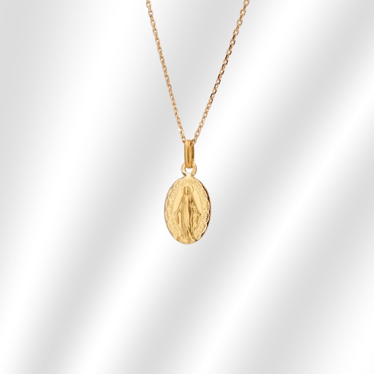 Notre Médaille Miraculeuse en or massif est de forme ovale, elle mesure 15 mm de hauteur et 11 mm de largeur ( 23 mm avec bélière).