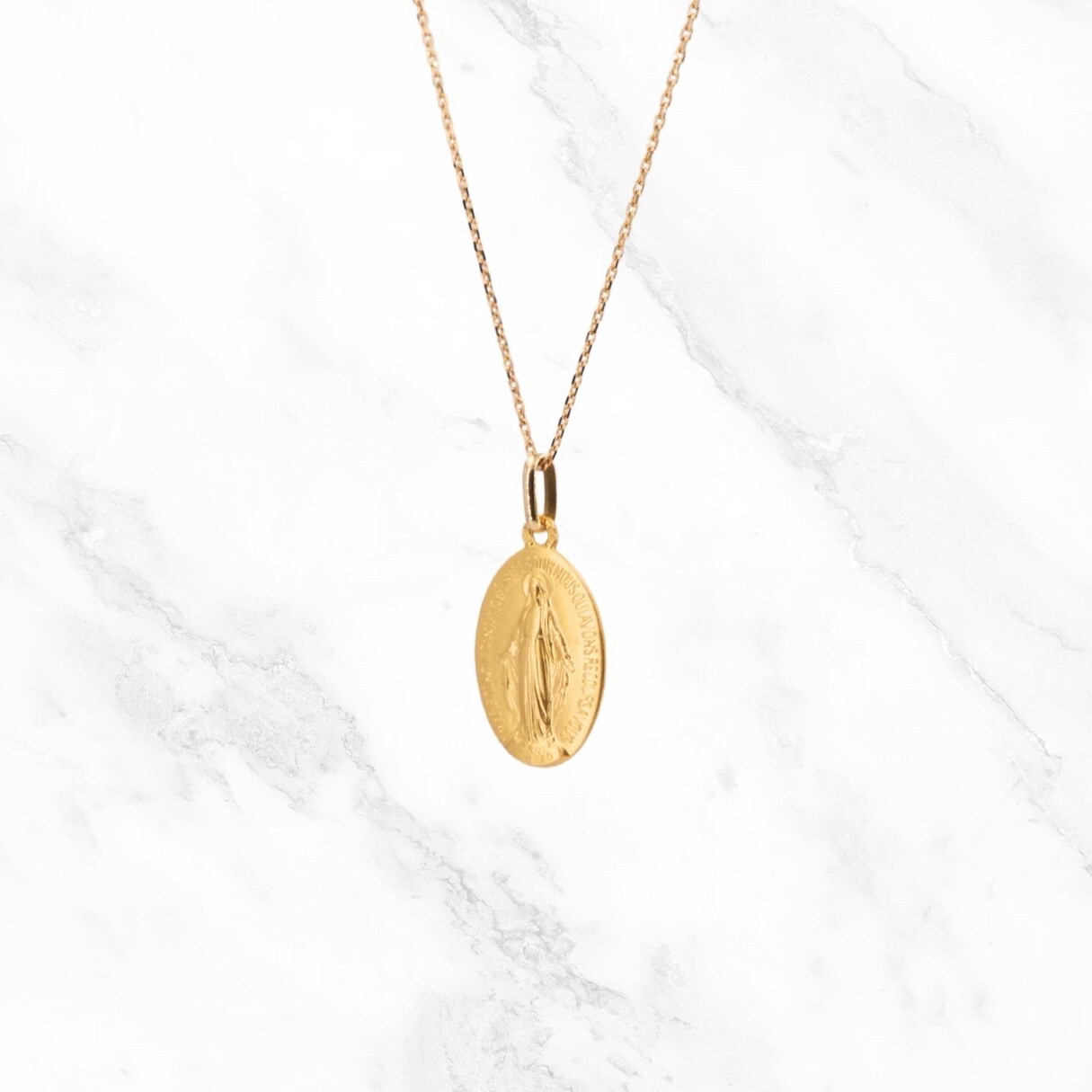 Notre Médaille Miraculeuse en or massif est de forme ovale, elle mesure 19 mm de hauteur et 14 mm de largeur (28 mm avec bélière).