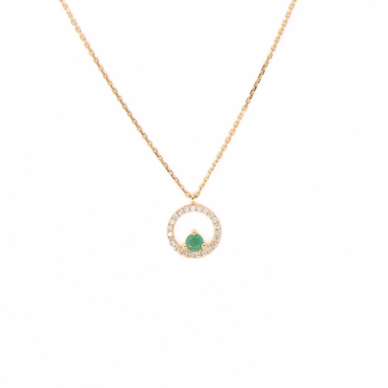 Ce collier en or jaune 750 millièmes allie élégance et originalité avec sa forme ronde, entièrement sertie de diamants pour un éclat précieux. Une légère touche verte grâce à une émeraude taille brillant serti par des griffes représente un amour éternel….