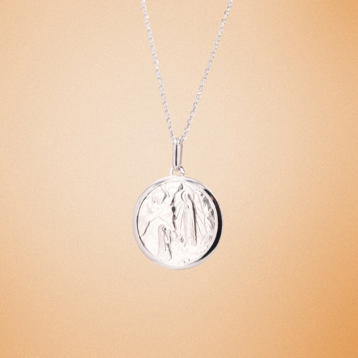 Bijou de foi et de protection, forgé dans un métal précieux, en or blanc 750 millièmes, notre médaille de Lourdes de forme ronde représente la grotte Massabielle avec l’apparition de la Vierge Marie à Bernadette Soubirous le 11 février 1858. Elle lui apparaîtra au total dix-huit fois, se révélant en disant :
