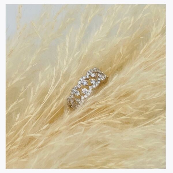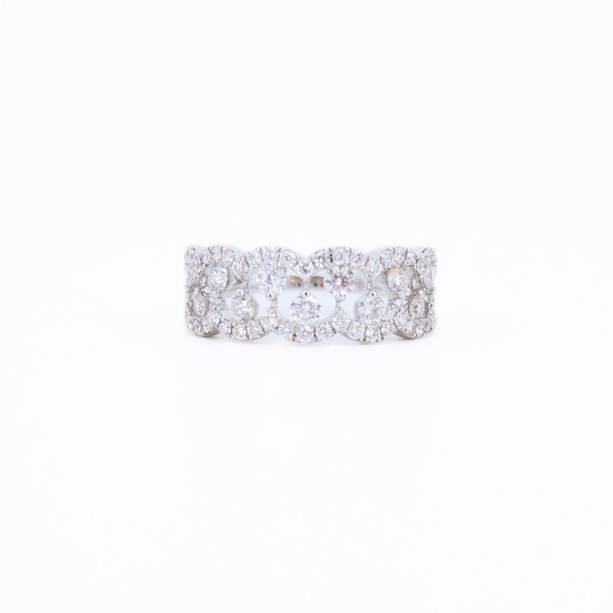 Tel un ruban de dentelle ciselé dans la lumière, La bague Princesse de la Ligne Vendôme, en or blanc 18 carats, dévoile une architecture précieuse. Son motif ajouré, d’une finesse remarquable, évoque les entrelacs d’une dentelle ancienne, tandis que les diamants, finement sertis, ponctuent chaque courbe avec éclat.