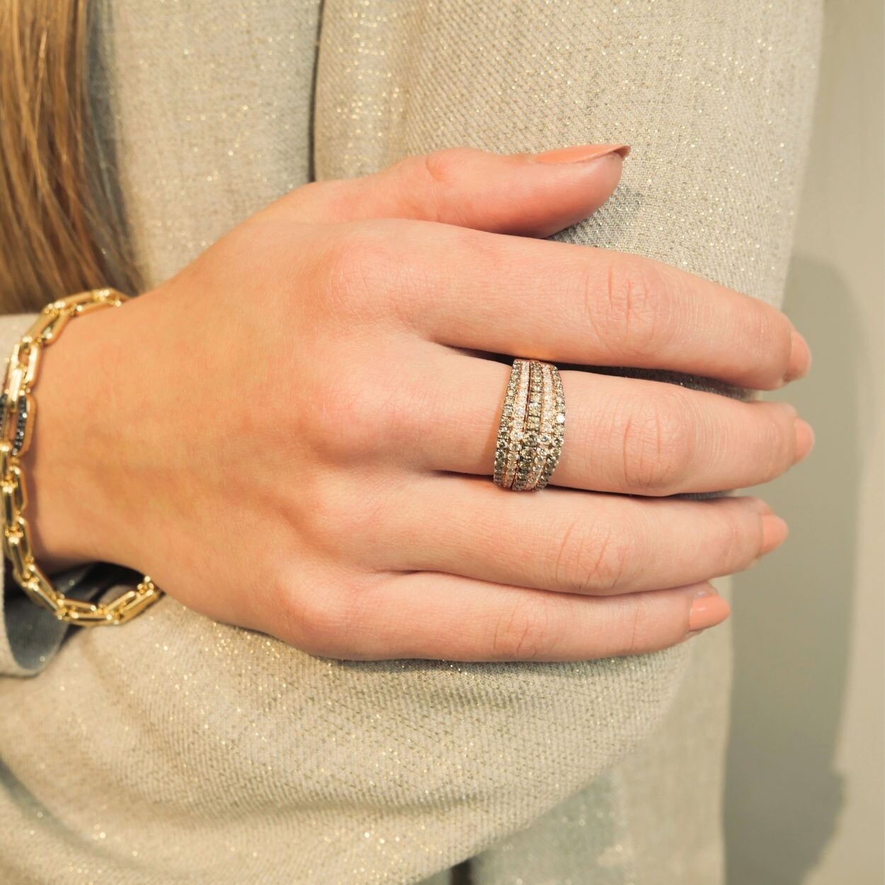 Confectionnée en or rose 18 carats, elle s’impose comme une pièce forte. Son pavage raffiné mêle diamants blancs et diamants bruns dans une composition nuancée, jouant sur les reflets et la profondeur. Ce dégradé de lumière et d’ombre, parfaitement maîtrisé, souligne les courbes amples de la monture et confère à la bague une allure résolument moderne.