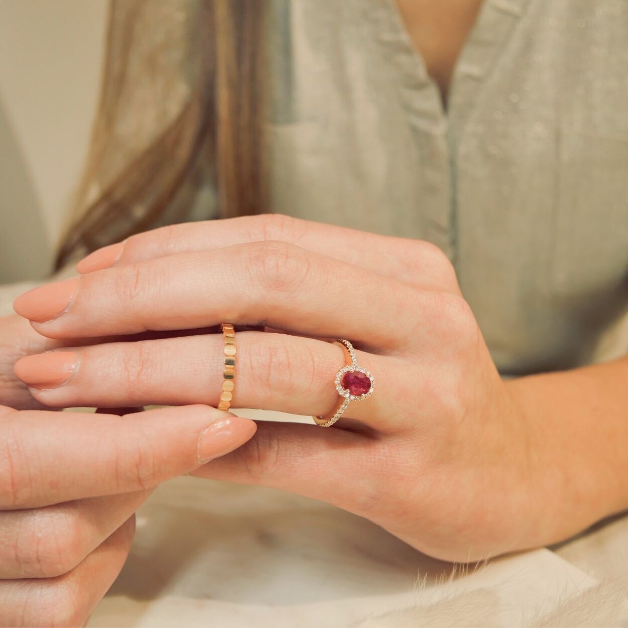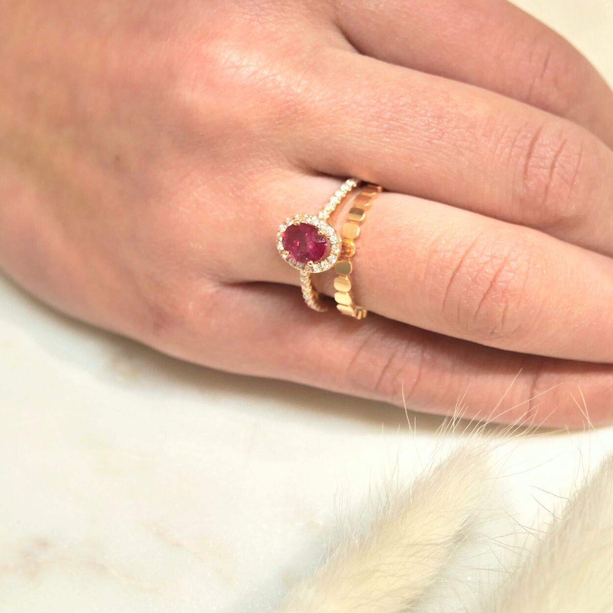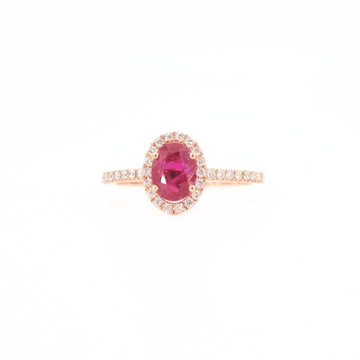 En son centre, un rubis d’un rouge profond capte le regard, magnifié par des diamants taille brillant qui l’entoure avec délicatesse. Les diamants se prolongent avec grâce sur le corps en or rose 18 carats de la bague.