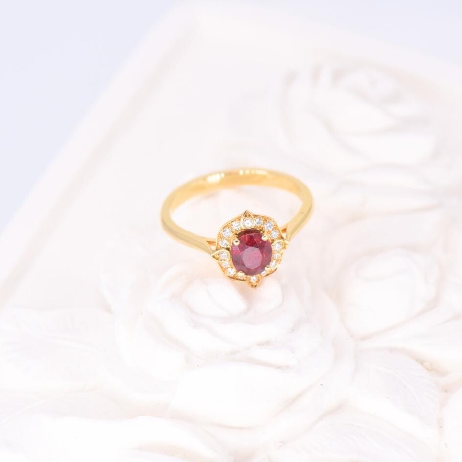 Symbole éclatant de 35 années d’amour partagé, cette bague en or jaune 18 carats se pare d’un rubis flamboyant et d'un entourage de diamants étincelants.