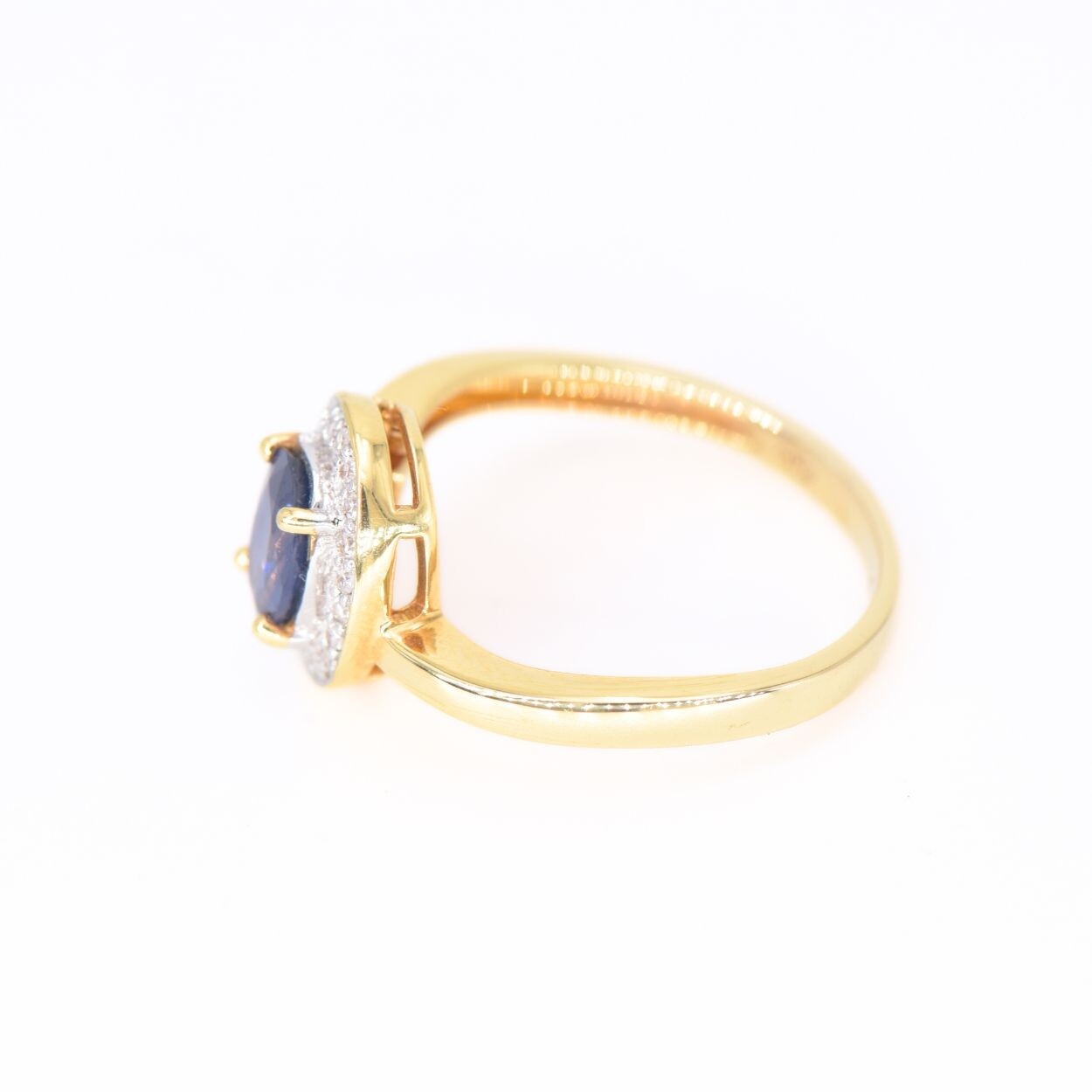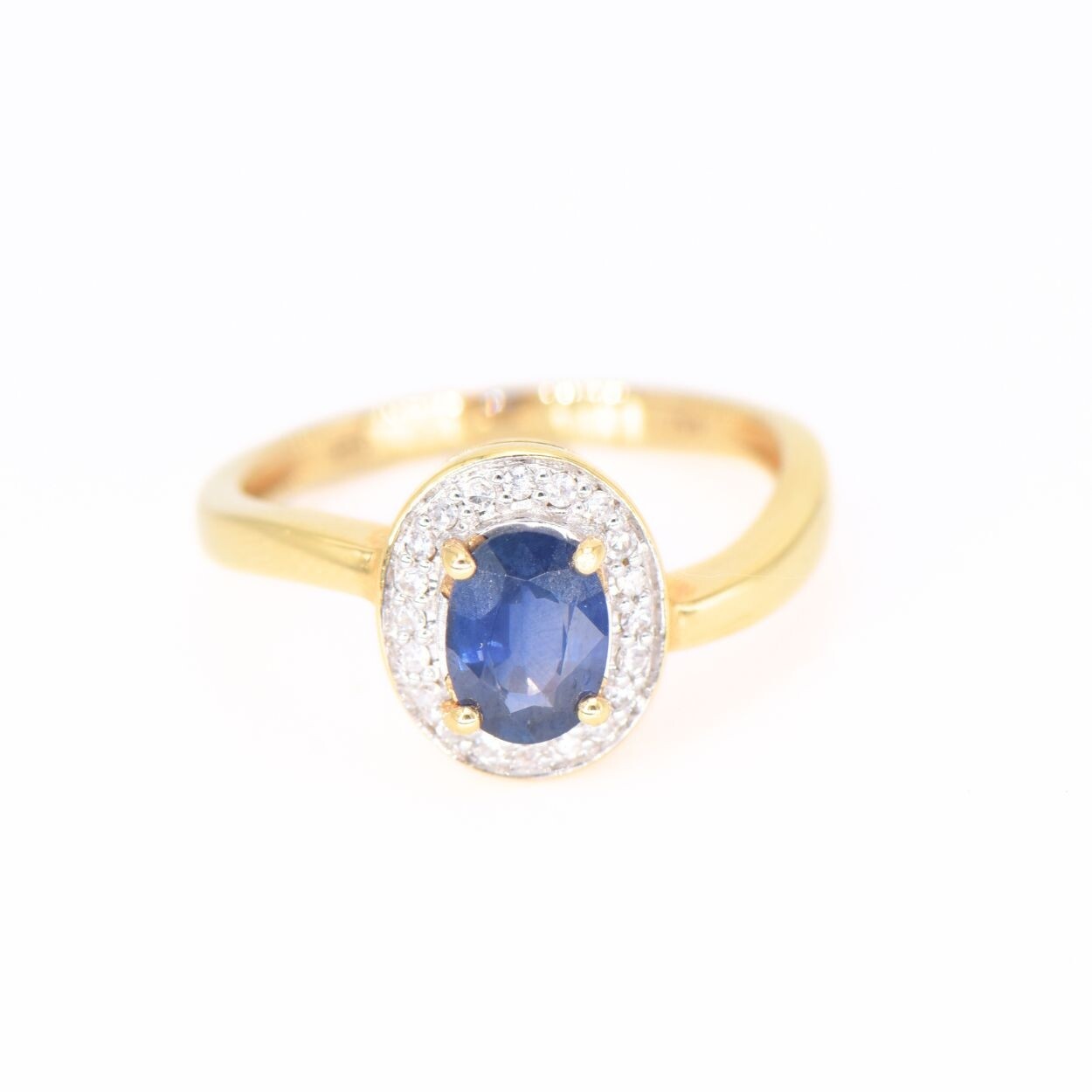 Bague en or jaune18 carats, sublimée par de délicats diamants et en son centre un magnifique saphir ovale. Son éclat chaleureux en fait un bijou plein de charme et de lumière.