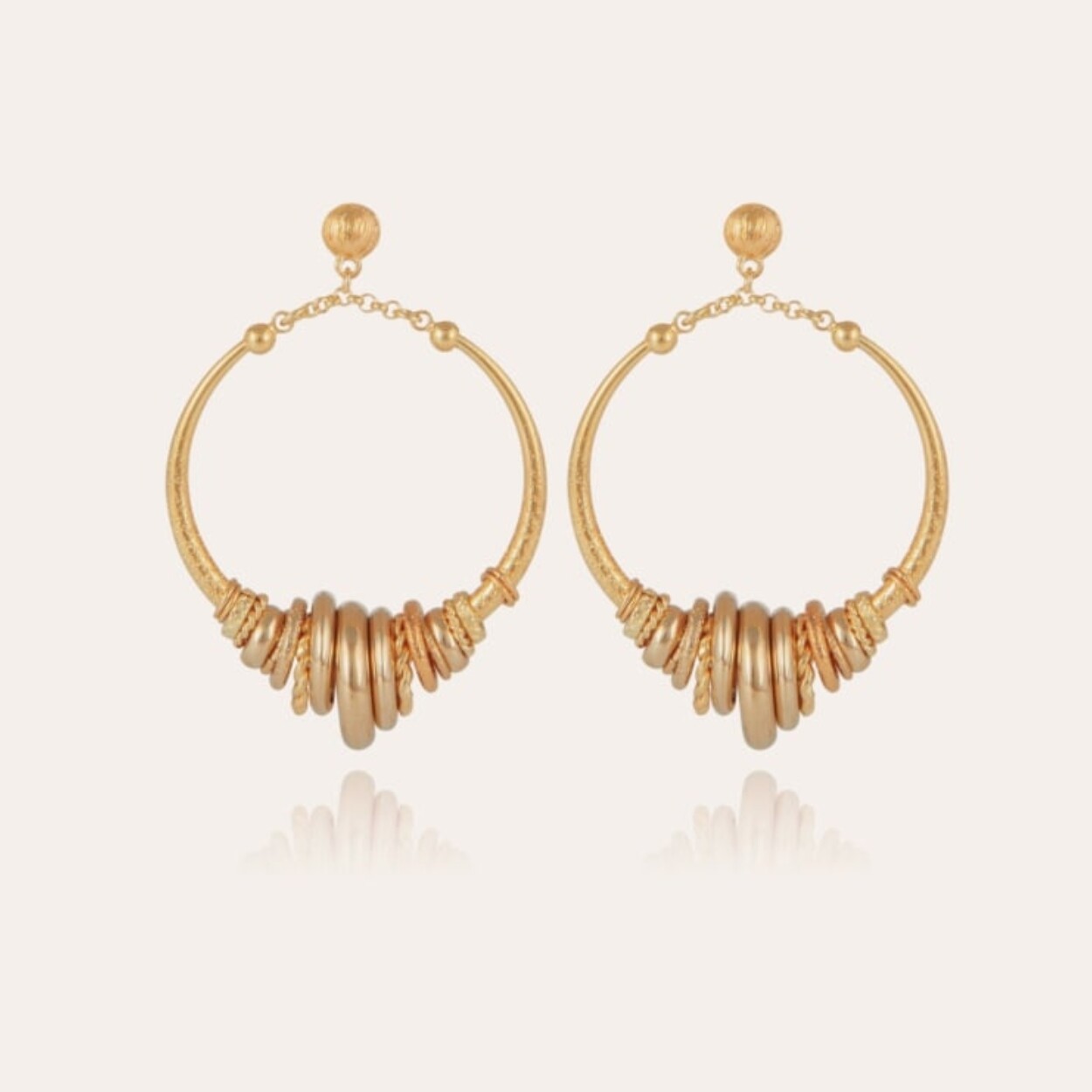 Les boucles d’oreilles de la collection Maranzana du créateur Gas Bijoux, modernes et audacieuses, revisitent le style vintage avec une cascade d’anneaux texturés assemblés à la main.