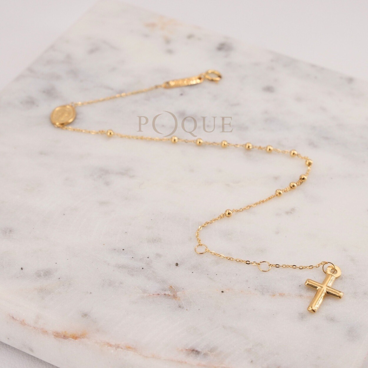 Bracelet dizainier en or 750 millièmes, poids 1g35, longueur 19 cm avec un anneau intermédiaire à 17,5 cm, Médaille miraculeuse 8 x 6 mm, Croix 12 mm.