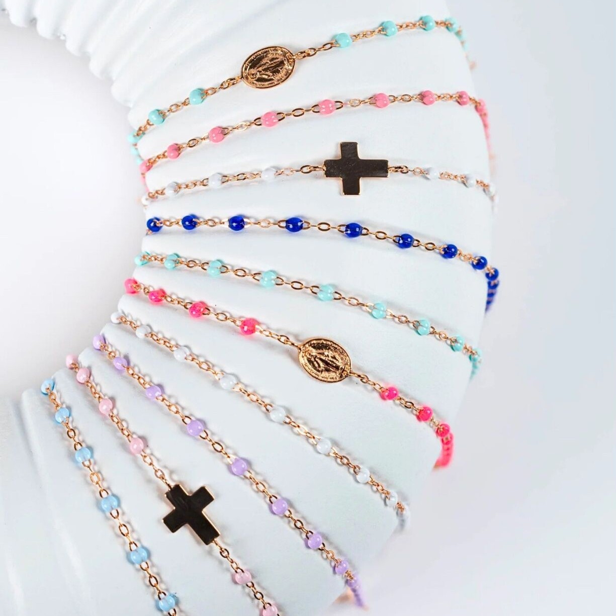 Découvrez notre bracelet Vierge miraculeuse Gigi CLOZEAU de la collection Madone : un subtil porte-bonheur moderne et élégant, alliant l’or rose 18 carats à des perles de résine jade.