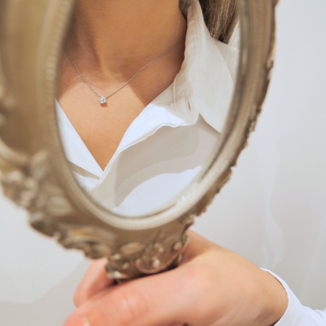 Laissez-vous séduire par notre collier en or blanc 18 carats, orné d’un diamant de 70 centièmes de carat serti 3 griffes, qui capte la lumière et diffuse un magnifique éclat à chaque mouvement.