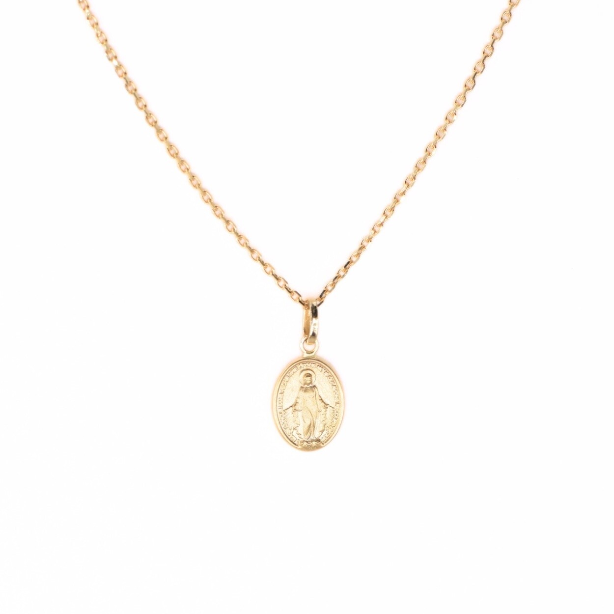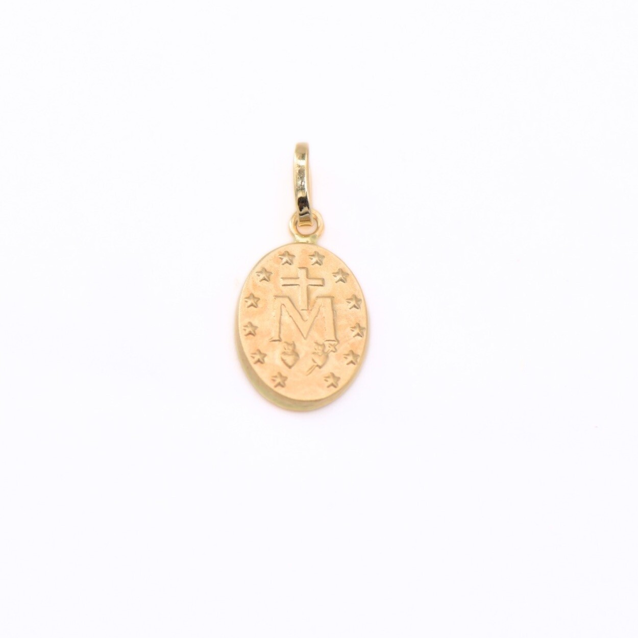 Notre Médaille Miraculeuse en or est de forme ovale, elle mesure 10mm de hauteur, 18 mm de largeur et 16 mm avec bélière (Pendentif vendu sans la chaîne).