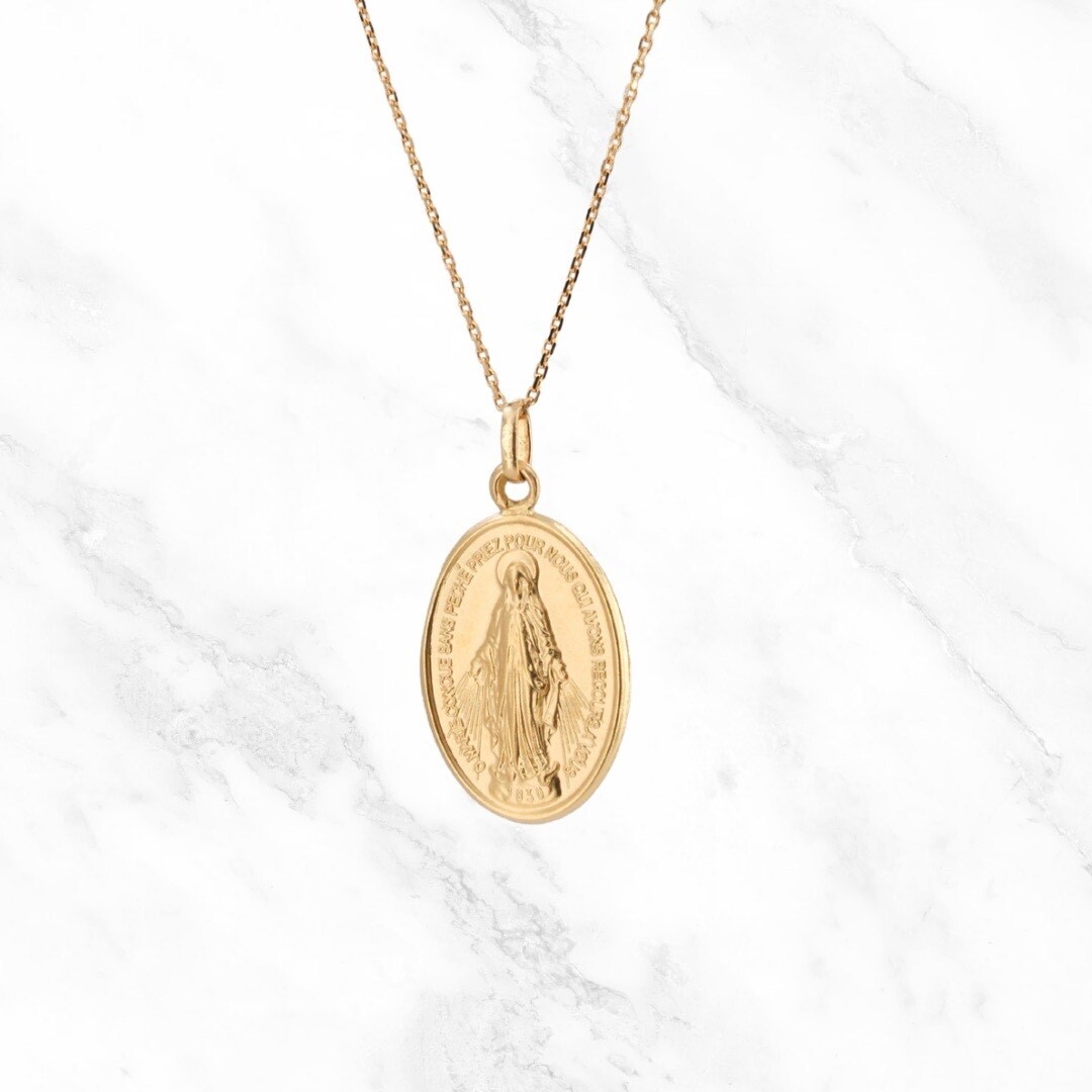 Un intemporel de foi, d’amour et de protection, cette médaille Miraculeuse en or jaune 18 carats est de forme ovale, elle mesure 25 mm de hauteur, 18 mm de largeur et 33 mm avec la bélière (Pendentif vendu sans la chaîne).